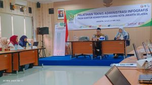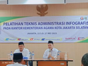 Pelatihan tekhnis administrasi infografis pada Kantor Kementerian Agama Kota Jakarta Selatan. Pola Pelatihan Teknis Infografis ditempuh melalui jalur klasikal di Wilayah Kerja masing-masing. Pola Klasikal merupakan proses pembelajaran yang dilakukan secara tatap muka di dalam kelas. Pada pelatihan ini peserta diberikan materi pelatihan berupa pengoperasian aplikasi canva sebagai media untuk membuat infografis menarik. Fasilitator berasal dari Badan Pendidikan dan Pelatihan Keagamaan Jakarta yaitu Dr. Ahmad Aulia dan Ahmad Wildanus, M. Kom. Peserta pelatihan sebanyak 30 orang yang terdiri dari unsur guru madrasah, staff Kantor Urusan Agama (KUA), dan Staff Kantor Kementerian Agama Kota Jakarta Selatan. Materi pelatihan terdapat 3 kelompok yakni kelompok dasar, kelompok inti, dan kelompok penunjang. Tujuan dari program pelatihan ini agar ke depannya para Aparatur Sipil Negara (ASN) di lingkungan Kementerian Agama Republik Indonesia (dalam hal ini Kementerian Agama Kota Jakarta Selatan) bisa membuat informasi yang menarik dalam bentuk infografis. Akhirnya peserta yang mengikuti kegiatan pelatihan dapat mengimplemantasikandi satuan kerja masing-masing.